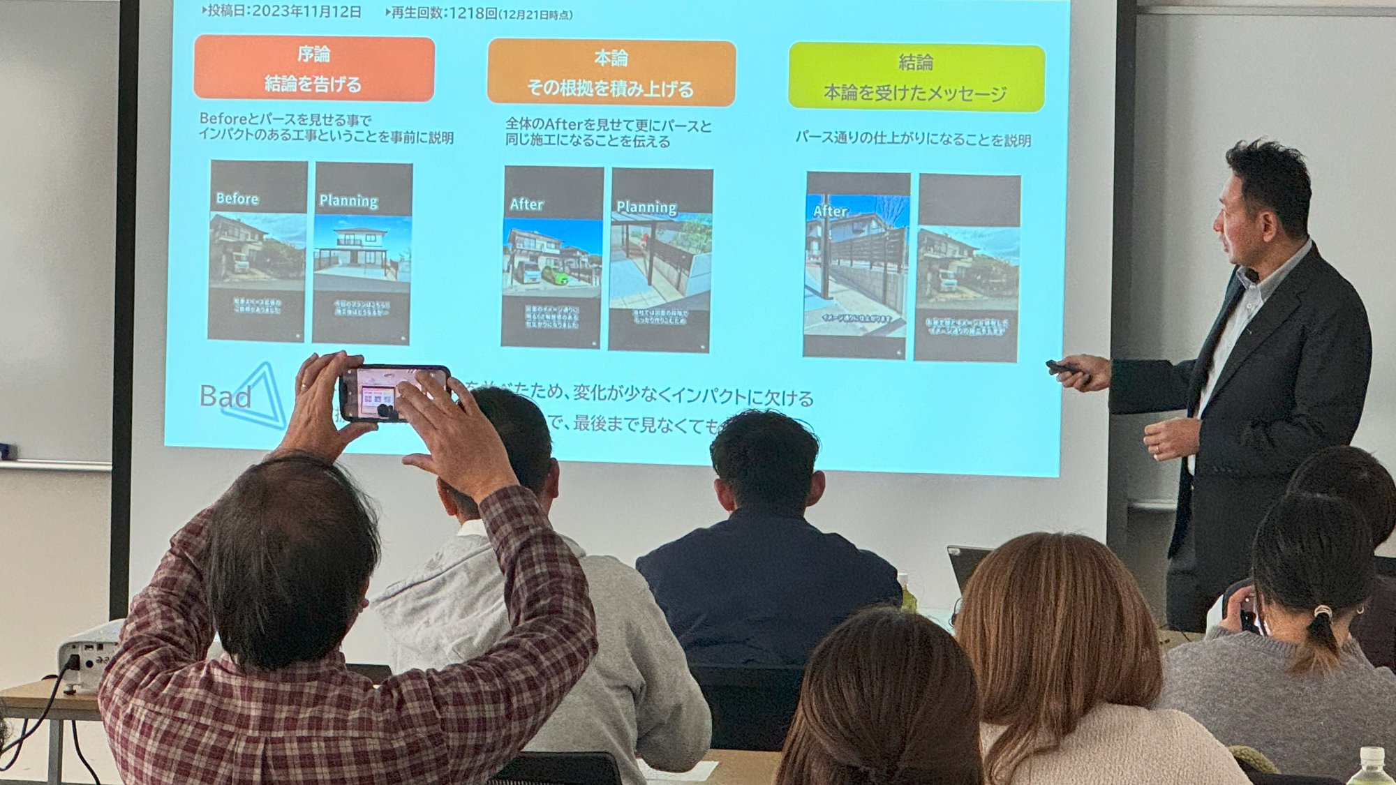 エクステリアの販工店様の撮影現場の事例をもとに、SNSやコンテスト応募のために外構をきれいに撮影するためのコツを特別にお伝えします。試験に始めたこの活動も今年で3回目となり毎回好評のため、通常20名で行っていましたが、今回は枠を40名まで拡大して実施します。毎回セミナーでは、グループワークを通して「ブランディング」や「マーケティング」を学んでいただきました。第3回目となる今回は『写真の撮り方』をテーマにセミナーを行います。なぜ写真に力を入れないといけないかをマーケティングの観点からもお伝えしますので、ご興味がある方はぜひご参加ください。